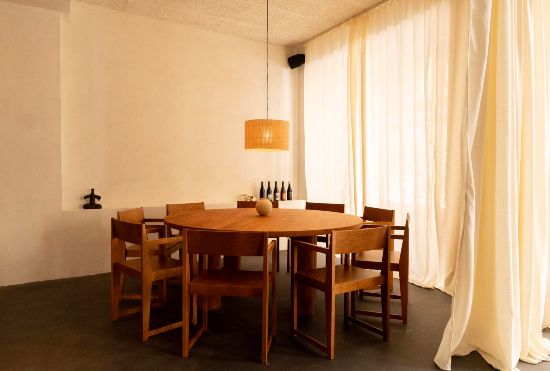 En la primera planta, a modo de reservado, hay una mesa circular con capacidad para 12 personas, con una gran cortina blanca que aporta la máxima privacidad. Esta planta incluye también una barra y cocina vista donde poder disfrutar de un cóctel y hacer más agradable la espera.