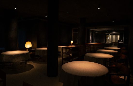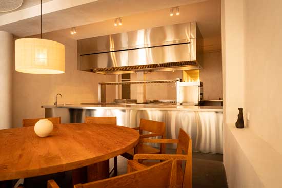 En todo el restaurante se han utilizado materiales continuos, como pavimentos de microhormigón y paredes de pintura a la cal. La rotundidad de los materiales combina con la delicadeza y colorido de los platos.