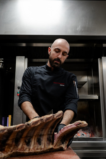 El chef elabora la que es considerada una de las mejores chuletas de Valencia en una parrilla de sólo 1 metro, alimentada con madera de marabú. Sólo utiliza las cinco primeras costillas del chuletero de la vaca para garantizar una carne limpia y sabrosa, de excepcional calidad.
