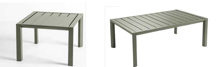 • Mesas bajas Sunset: enuevo color green lichen, en dos posibles medidas( 50 x 50 cm. y 100 x 60 cm), 100% poliéster pintado y con tacos antideslizantes. Ultraligeras y resistentes.
