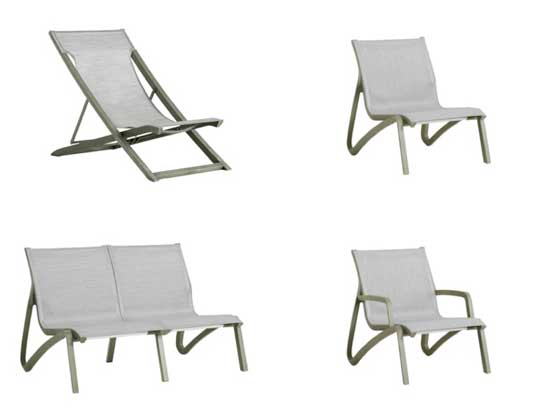 Tanto la estructura de este mobiliario como el tejido cuentan con recambios y están inspirados en tonos vegetales: estructura en verde líquen y textilene de algodón en tono gris