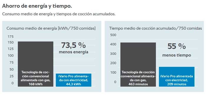 Además, el tiempo de cocción con la iVario se reduce en un 55% en función del precio en kWh de ambas energías, lo que puede se traduce en un ahorro sostenible y que puede favorecer el cambio de energía de gas a electricidad.