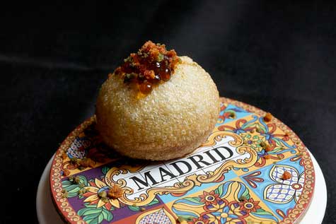 La tapa ganadora ha conquistado al jurado gracias a una variada combinación de ingredientes e influencias, como el pan frito indio panipuri, típico del street food de Asia del Sur y que guarda en su interior un guiso castizo de manitas de cerdo, al que unas esferificaciones de vermú dan el toque de frescura, rematado con polvo de aceitunas.