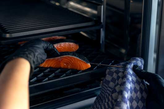 Además, los hornos iCombi Pro y ConnectedCooking garantizan que los alimentos alcancen siempre la temperatura deseada. Un ejemplo: el cocinero quiere calentar los alimentos a 72 grados tanto en la superficie como en el núcleo para eliminar la mayoría de los microorganismos. El iCombi Pro se lo pone fácil con rutas de cocción inteligentes y una sonda de núcleo integrada. El usuario marca la temperatura deseada, introduce la sonda en el alimento, inicia el proceso de cocción y el sistema informa cuando se alcanza la temperatura.