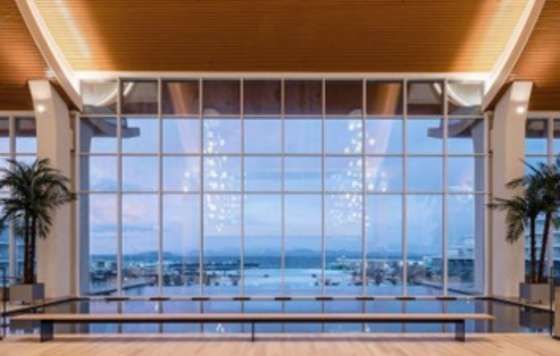 El lobby principal se erige como un espacio singular que integra un diseño distintivo, sin pilares, con un techo geométrico de inspiración volcánica y una lámina de agua que se fusiona con las piscinas exteriores de cota 9 y el mar, creando un efecto infinity.