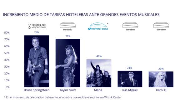 Los grandes conciertos se traducen en una alta demanda hotelera y el consecuente aumento de tarifas. Según este informe, los precios de los hoteles madrileños se incrementaron entre un 23% y un 76% de media durante los días de los conciertos en las zonas de influencia del lugar de celebración, con incrementos de hasta un 110% en una de las fechas de Bruce Springteen.
