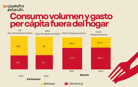 El Informe de Consumo Alimentario 2024 , que elabora el Ministerio de Agricultura, Pesca y Alimentación (MAPA) refleja que el consumo fuera del hogar no ha aumentado en España en el año 2024, siendo un 0,2% más bajo que el año anterior. En total, el gasto en alimentos (incluye aperitivos) y bebidas fuera del hogar asciende a 35.872,35 millones de euros, lo que equivale a 3.845,22 millones de kg o litros y cerca de 12.493,50 millones de consumiciones.