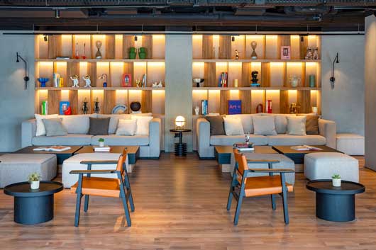 Profesionalhoreca, vestíbulo del hotel Innside Madrid Valdebebas con textiles de Carmela Martí
