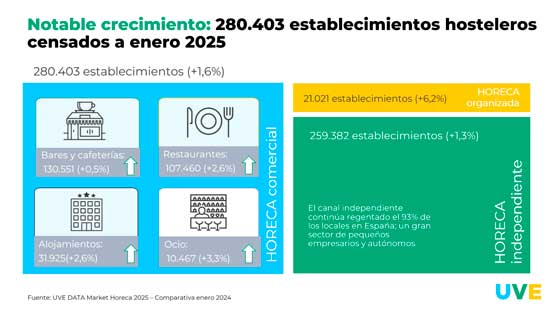 Con 280.403 establecimientos, la hostelería española continúa así el crecimiento continuado en los últimos años, señala el informe UVE Data Market Horeca 2025.