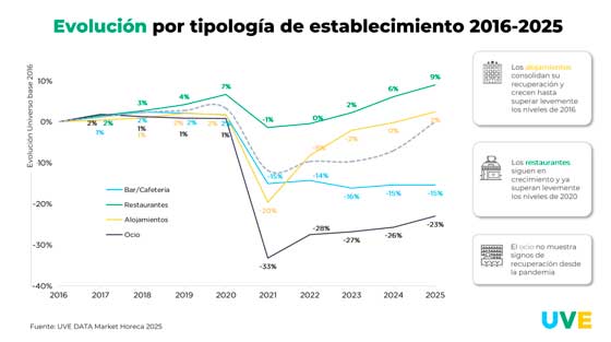 El informe Uve Data Market Horeca 2025 también permite comparar la evolución del número de establecimientos con años anteriores.