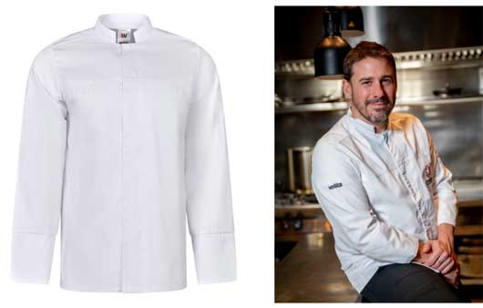 Para la cocina de La Barra de La Tasquería se ha optado por esta chaqueta de microfibra con espalda Coomax de manga larga, que destaca por su tejido con tratamiento antibacterias y repelente de líquidos. Tiene un cierre central asimétrico, con botones automáticos ocultos, y cuello tirilla.