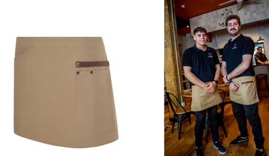El equipo de sala se viste con un delantal corto canvas bicolor, con cintas ajustables de espiga de algodón, en color contraste, y remaches estilo vaquero. Lleva una tira para colgar el paño, y tiene tres bolsillos: un bolsillo amplio asimétrico con un bolsillo interior, y un bolsillo de parche en lateral izquierdo, con compartimento para bolígrafo. El tejido es Canvas (65% poliéster – 35% algodón / 320 g/m2).