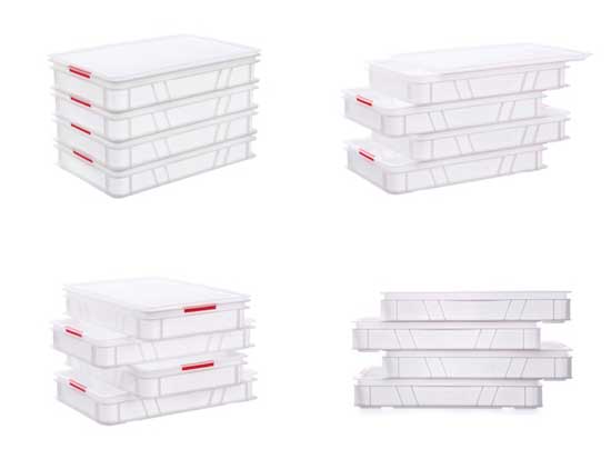 Están fabricadas en polipropileno, material de máxima resistencia, libre de BPA, que soporta temperaturas de -40 a 95 grados. Destacan por su borde reforzado con zona de agarre perimetral que facilita el manejo y transporte, y refuerzos laterales que proporcionan robustez. Las paredes interiores lisas facilitan la extracción de las masas, y los cantos redondeados son de de fácil limpieza.