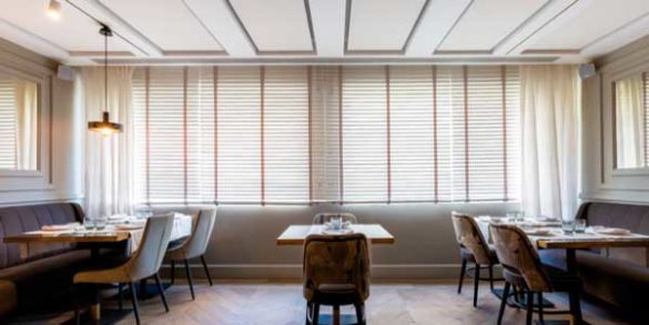 El restaurante El Capricho de Raquel, en la pedanía costera de Urbanova (Alicante), luce unas venecianas de madera de la firma Saxun que aportan calidez y calma a su sala, además de regular eficazmente la luz.