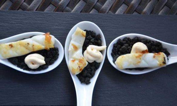 Calamares con ali oli sobre tierra de tinta: una tapa diferente con tinta de sepia Sepink