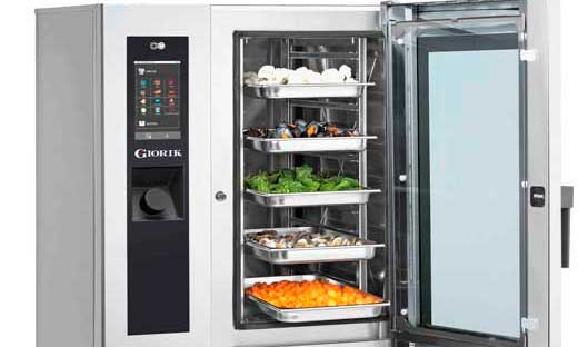 El horno Steambox Evolution es el modelo más avanzado de Giorik. Se trata de un horno inteligente que permite cocinar al mismo tiempo y a distintos niveles diferentes platos, optimizando el trabajo en cocina y ahorrando costes.
