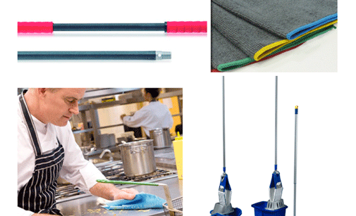 Visto en Hygienalia+Pulire: fregado en plano, bayetas de microfibra, palo ergonómico
