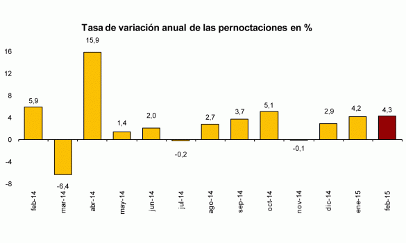 Continúan los «brotes verdes» en el sector turístico: las pernoctaciones en establecimientos hoteleros aumentan un 4,3% en febrero, y España registra un nuevo récord con 6,4 millones de turistas internacionales entre enero y febrero, un 4,5% más.