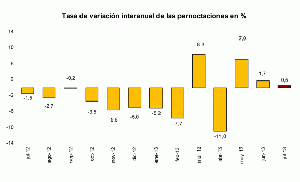 Las pernoctaciones en hoteles han aumentado un 0,5% en julio respecto al mismo mes de 2012, revelan los últimos datos del Ine. Un ligero incremento que se debe a exclusivamente a los turistas extranjeros. Los precios hoteleros también suben ligeramente, al igual que la facturación e…