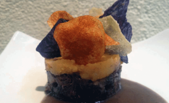 Esta es la receta Toros de guisando toro: rabo de toro guisado y deshuesado con vino tinto puré de batata, y chips de patata vitelotte, que realizan en la Taberna Rayuela (Morería, 8, esquina calle Bailén, tel. 91 365 82 76) de Madrid: Ingredientes Rabo de toro:…