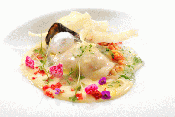Ostra ligeramente ahumada a la parrilla con jugo espumoso de puerros jóvenes