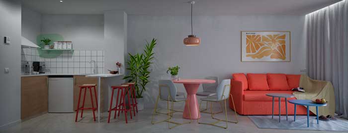 • Para las familias que deseen una mayor autonomía, Coral Star Ibiza cuenta con apartamentos espaciosos y completamente equipados con kitchenette, zona de comedor y sala de estar. Su diseño es minimalista, e igualmente lumonoso y relajado. Son la opción perfecta para estancias más largas o para familias que quieren un espacio propio.