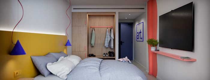 • Las habitaciones del hotel, en diversas categorías (Superior, Junior Suite, Studio y Studio Terrace), están pensadas para quienes desean todos los servicios del hotel con un extra de diseño y comodidad. Se caracterizan por sus espacios amplios, terrazas soleadas, camas king-size, sofás cama y una estética que combina madera natural, colores suaves y detalles gráficos llenos de personalidad.