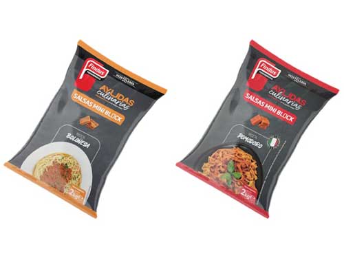 Las dos salsas, en cómodo formato mini block o mini bloques, se ofrecen congeladas y se preparan salteándolas en sartén unos minutos o en el microoondas. Se ofrecen en bolsas de 2 kg.