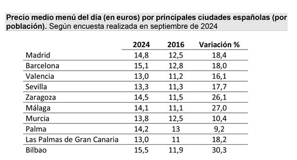 Precio medio menú del día (en euros) por principales ciudades españolas (por población). Según encuesta realizada en septiembre de 2024: