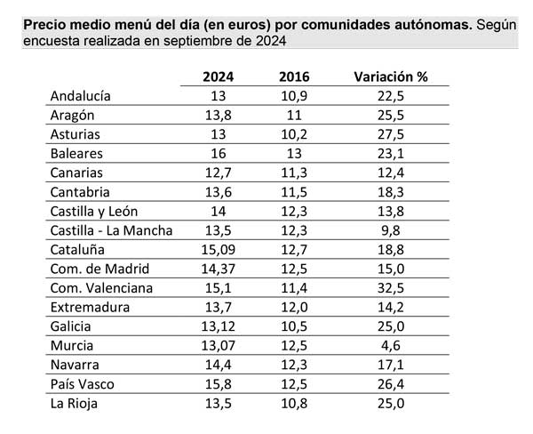 El precio medio del menú del día en 2025 en España es de 14 euros, un 6,1% más que en 2024, revela un estudio de Hostelería de España y Edenred. No obstante, el 42,3 % de los empresarios hosteleros ha experimentado en el último año una pérdida de rentabilidad por el aumento de los costes. La ciudad con el menú del día más caro es Bilbao.