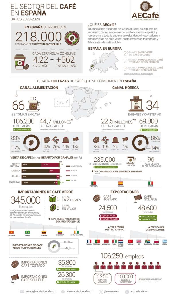 Según el Informe Sectorial del Café en España (2023-2024), en 2024 la producción nacional de café superó las 218.000 toneladas, lo que supone un aumento del 1,13% respecto al año anterior, como consecuencia del crecimiento del café tostado con cafeína (+5,7%). Además, España sigue ocupando posiciones destacadas en el ranking europeo de productores de café descafeinado y soluble.