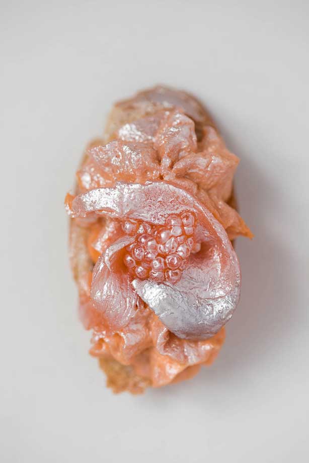 Pan de masa lenta Mum, queso fresco, huevas de trucha, 1 loncha de salmón ahumado y colorante alimenticio en spray de color plata.